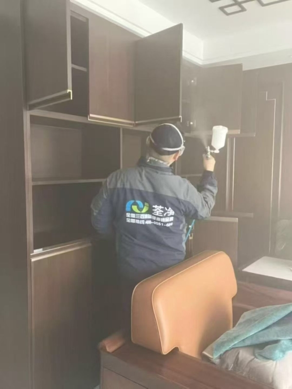 | 序号:2 | 治理区域:高温熏蒸处理 | 操作流程:1.对家具内部、抽屉、衣柜等密闭空间进行50℃低温熏蒸(20分钟/件);2.配合甲醛清除剂使用,加速深层甲醛释放。 | 质量标准:熏蒸温度稳定50℃±3℃,甲醛加速释放率≥200%,无材质变形损伤,无刺激性气味残留。 | 验收方式:校方代表监督熏蒸过程,记录温度与时间参数,确认无异味。 |